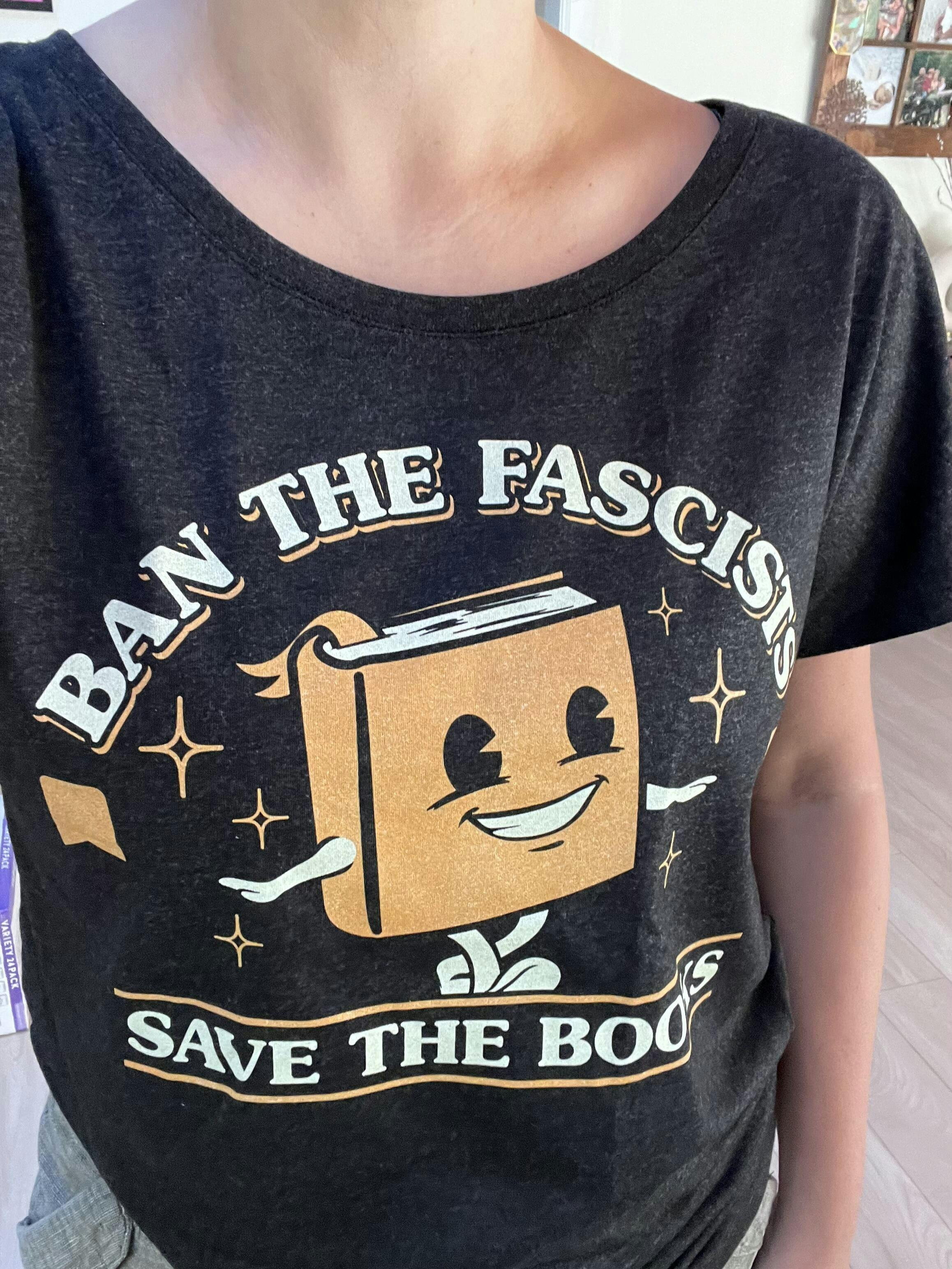 Banning books is a tool of oppression about as old as books themselves. Being big proponents of free speech, books, and reading we'd rather ban the fascists and save the books. Bigots might believe that having a library or school curriculum free of books that refer to sex, racism, or being queer will ensure their kids turn out just as backwards and narrow-minded as they are, but they can dream on. This book lover shirt is a must have for a reader, English teacher, or librarian who believes in free speech and comprehensive education for all.
