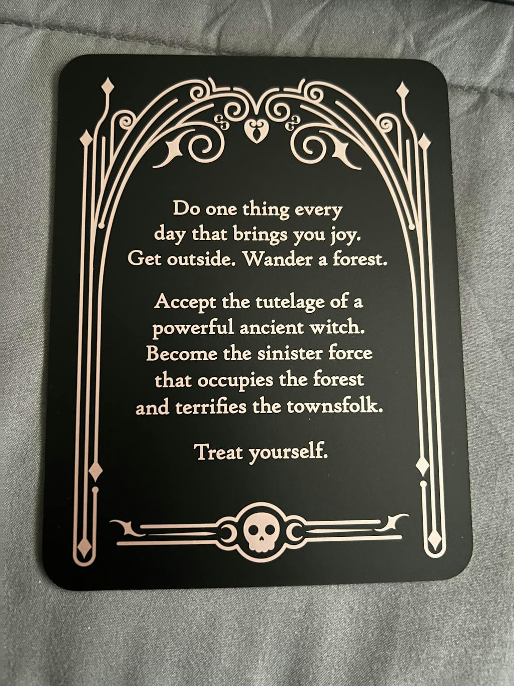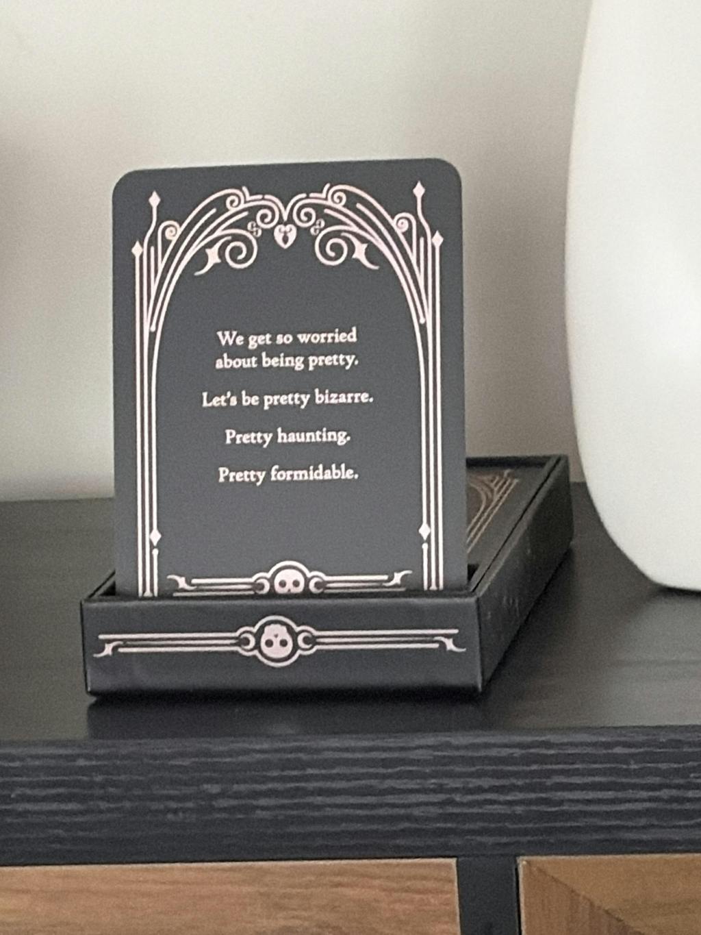 We wanted to create an affirmation deck for people like us. We created this set of spooky yet funny cards because they contain the kind of quotes that make us feel seen. If you're more of a Wednesday Addams than a Disney princess this affirmation deck is for you, too.