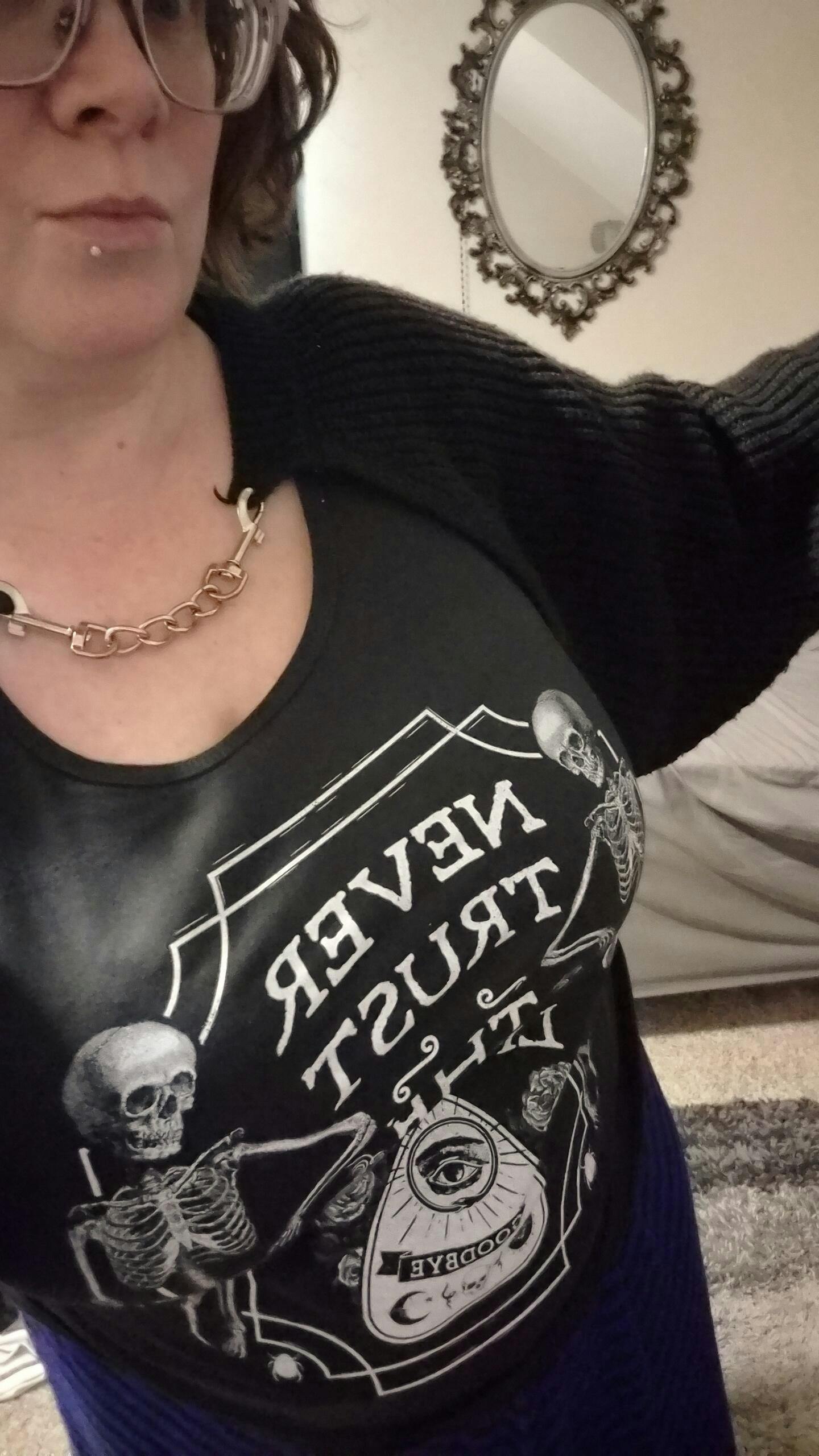 Show off your sense of goth horror style with this creepy cute shirt that's perfect for the occult enthusiast. It's the perfect fashion statement for a seance, lurking in the cemetery, or trying to summon the undead. Loaded with skeletons, skulls, and gothic grunge charm, this death positive shirt will impress ghosts and mortals alike.