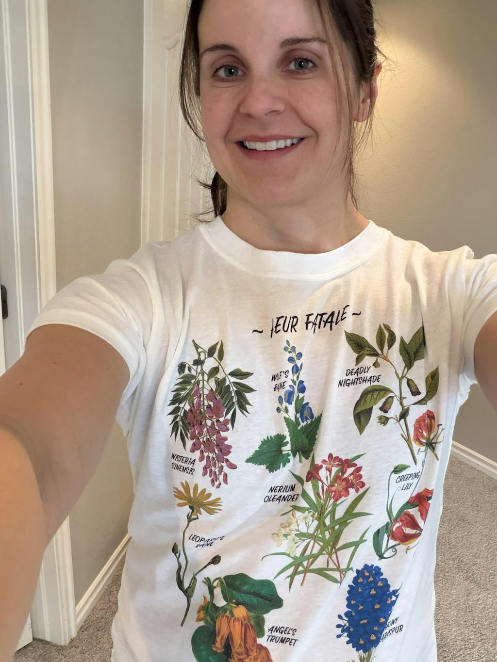 At last I am armed with my comfortable Fleur Fatal T-shirt! I now can look stylish and carry out poison plots with floral fierceness. I really do love how soft it is and recommend sizing up if you want a looser fit. I am impressed by the quality and will be ordering from boredwalk again. :)