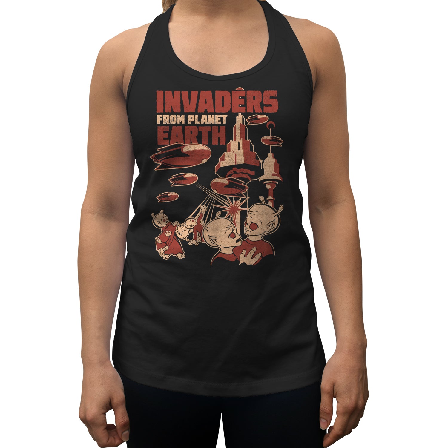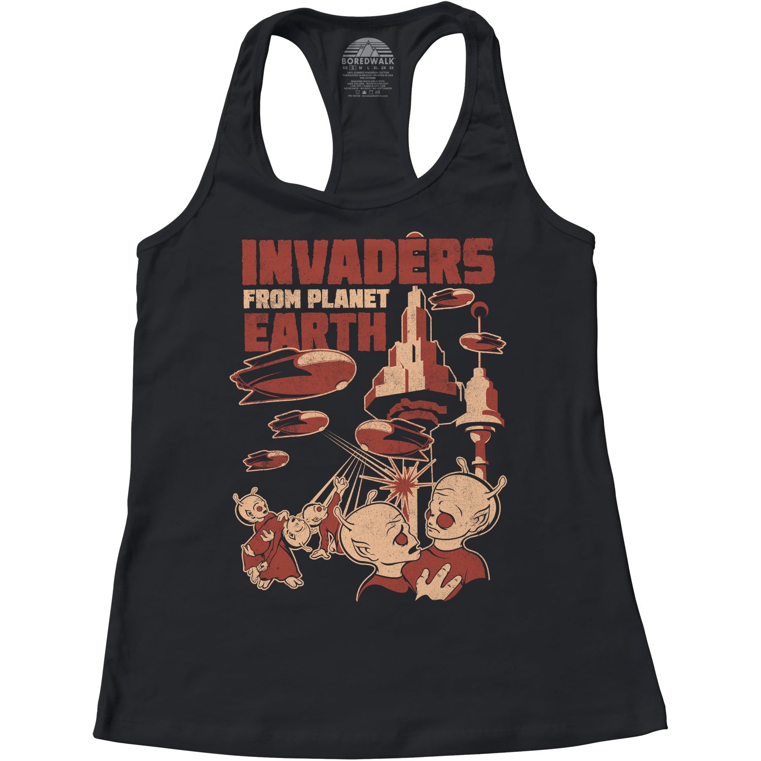 This geeky retro inspired sci fi graphic features aliens running from an outer space invasion. In our re-imagined vintage scifi adventure the extraterrestrial threat comes from UFOs being piloted by earthlings. Take cover from the alien flying saucers before it's too late! This nerdy pulp function aesthetic shirt makes a great gift for fans of astronomy and science fiction.