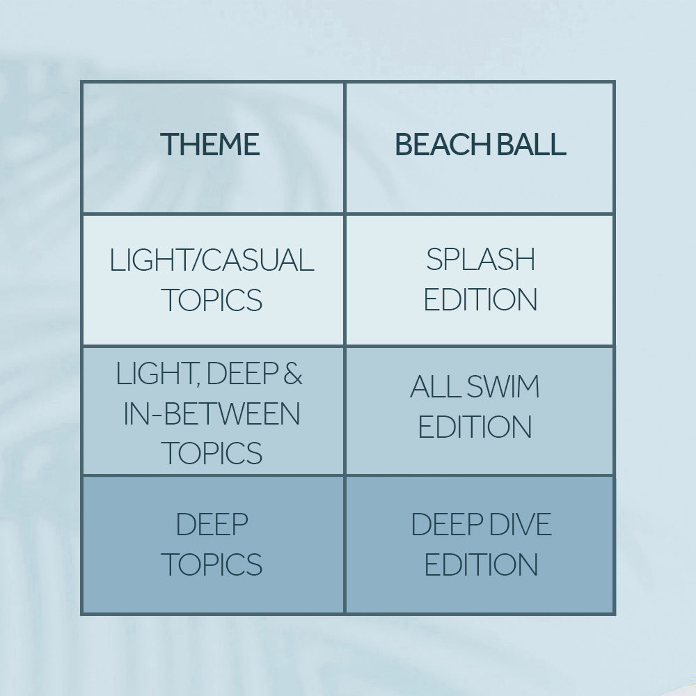 The Splash Edition has light and casual questions. It's perfect for pool parties, beach gatherings, or any event where you want to keep conversations light and easy.