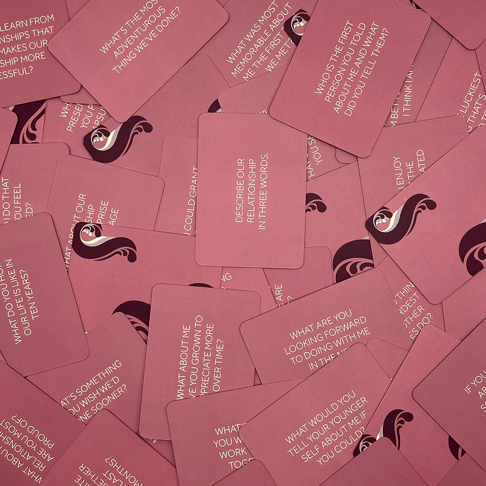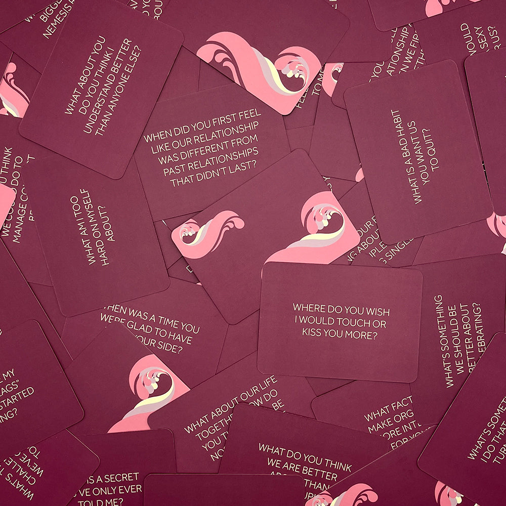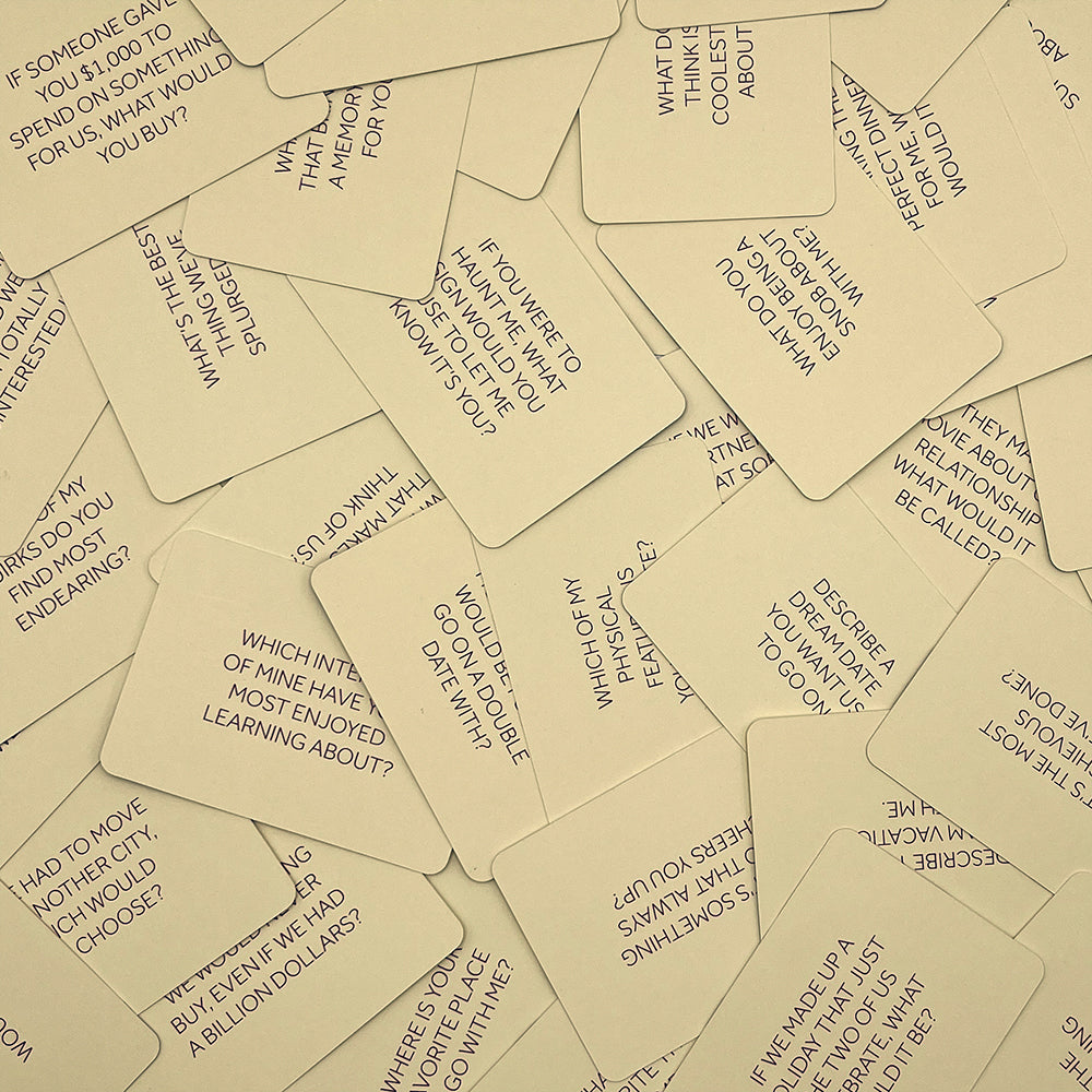 We organized our questions into levels of intimacy because when we tried other conversation decks on the market we found the questions were all over the place. Sometimes we're with people we're close with and are okay with talking about feelings, childhood, and other more personal topics. Sometimes we just want to have fun and talk about TV shows we hate or our unpopular opinions about food. We designed our Delve Deck to help you modulate the kind of conversation you want to have.