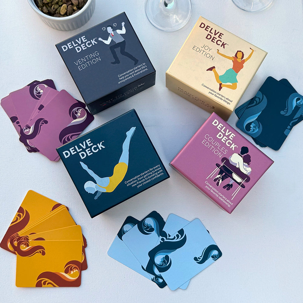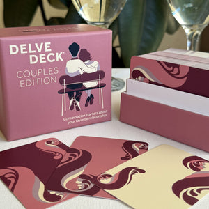 Whether you're looking to deepen connections with the original Delve Deck®, level up your gratitude practice with Delve Deck: Joy Edition, engage in healthy shadow work with Delve Deck: Venting Edition, or spark fresh conversations between romantic partners with Delve Deck: Couples Edition, each of these color coded card sets feature multiple intimacy levels to choose from and have been thoughtfully designed to enhance any conversation.