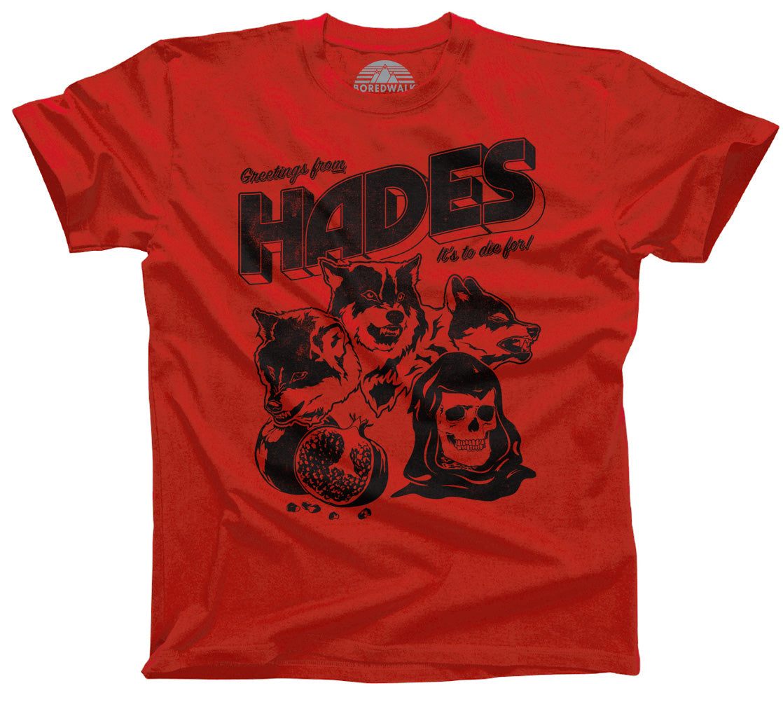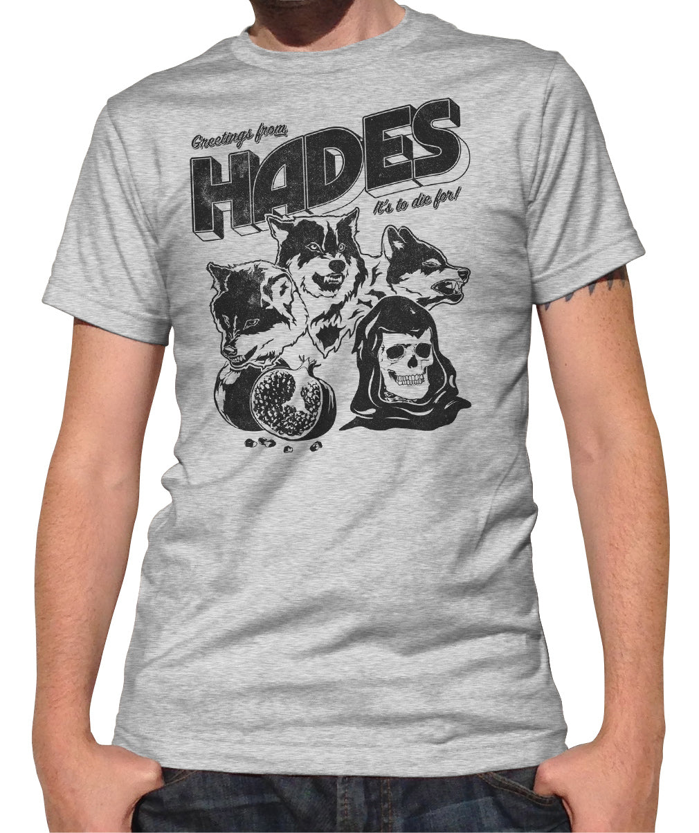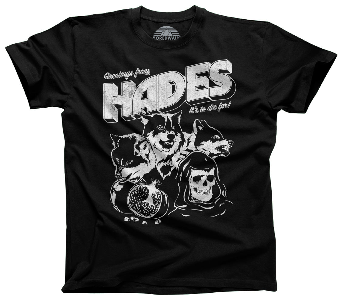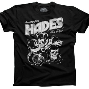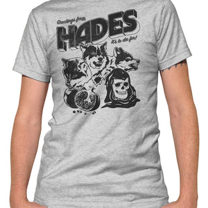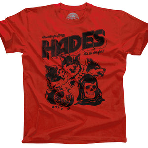 Send your regards from Hell in style with this funny Hades shirt, featuring Satan's pals the grim reaper and Cerberus. You'll have a devil of a good time in this underworld inspired shirt, loaded with Greek mythology, literary references, and dark humor.