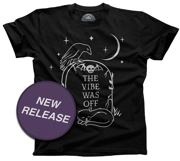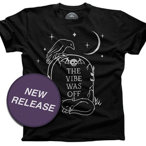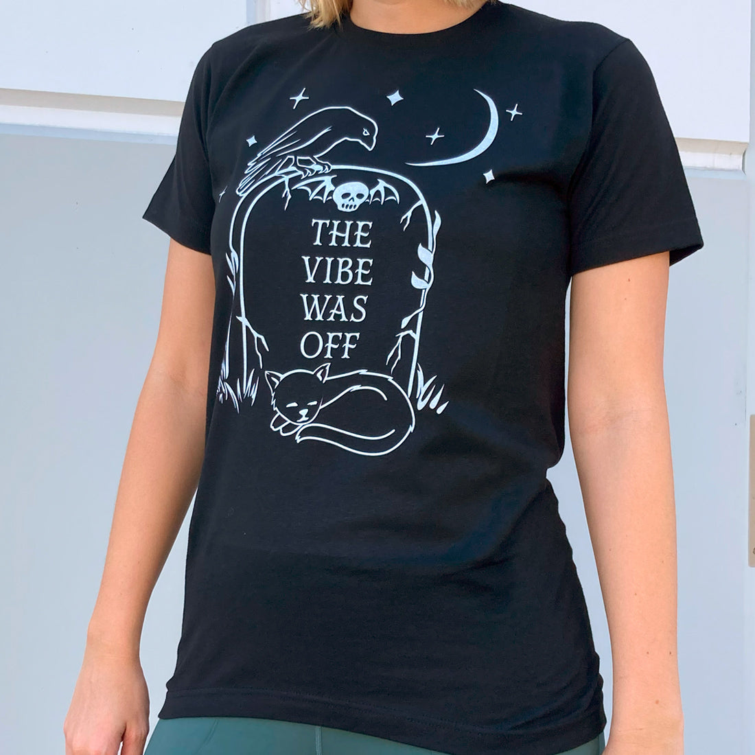 This spooky cute shirt makes a great gift for the death positive goth in your life. It's perfect for Halloween or just lurking around the graveyard. It features our original tombstone illustration complete with cat and crow familiars. This is one fun shirt that will not kill the vibe.