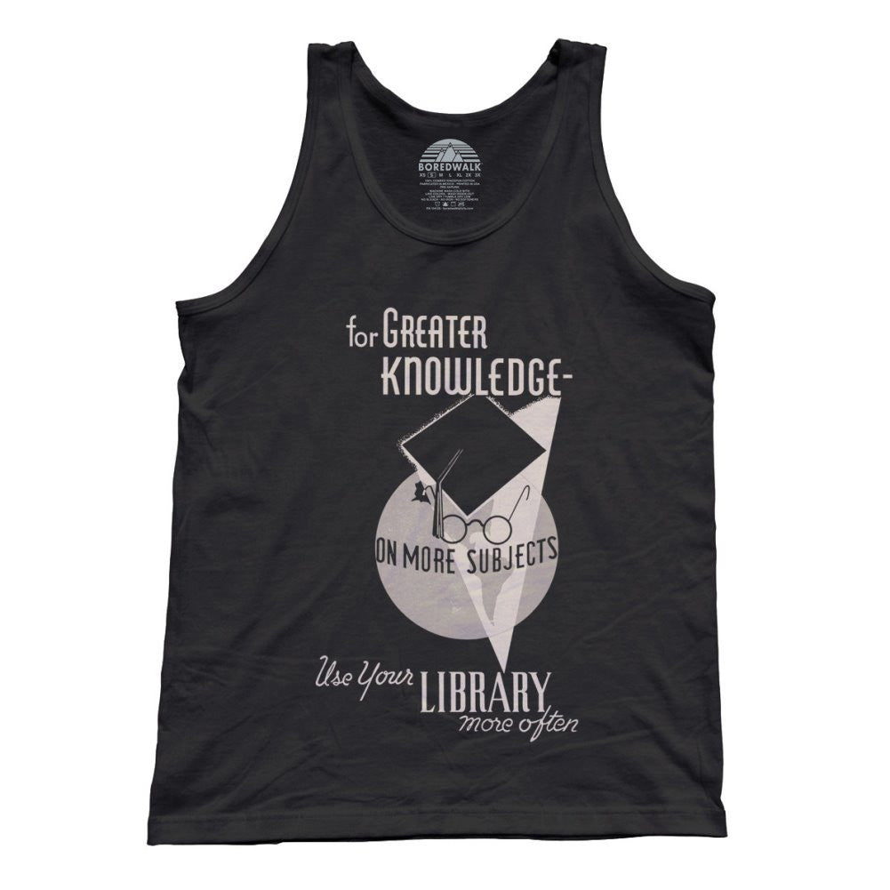 Hey, bookworm! Looks like when you're not soaking up knowledge at your local library you're perusing for some cool shirts that speak to your passion for reading! Whether you're a librarian who appreciates vintage aesthetic tank tops or a nerdy book lover who swoons over antique aesthetic shirts on Etsy and Tumblr, this geeky unisex tank top featuring a vintage WPA (Works Progress Administration) poster design intended to entice more frequent usage of the public library system during the 1930s and 1940s is bound to make your pages flutter. So, if the library or little old bookstores deeply satisfy your hunger for learning or immersing yourself in great fiction, please take the time to express yourself by sharing your humble pastime with our "For Greater Knowledge - on more subjects - Use Your Library More Often" reading tank top!"