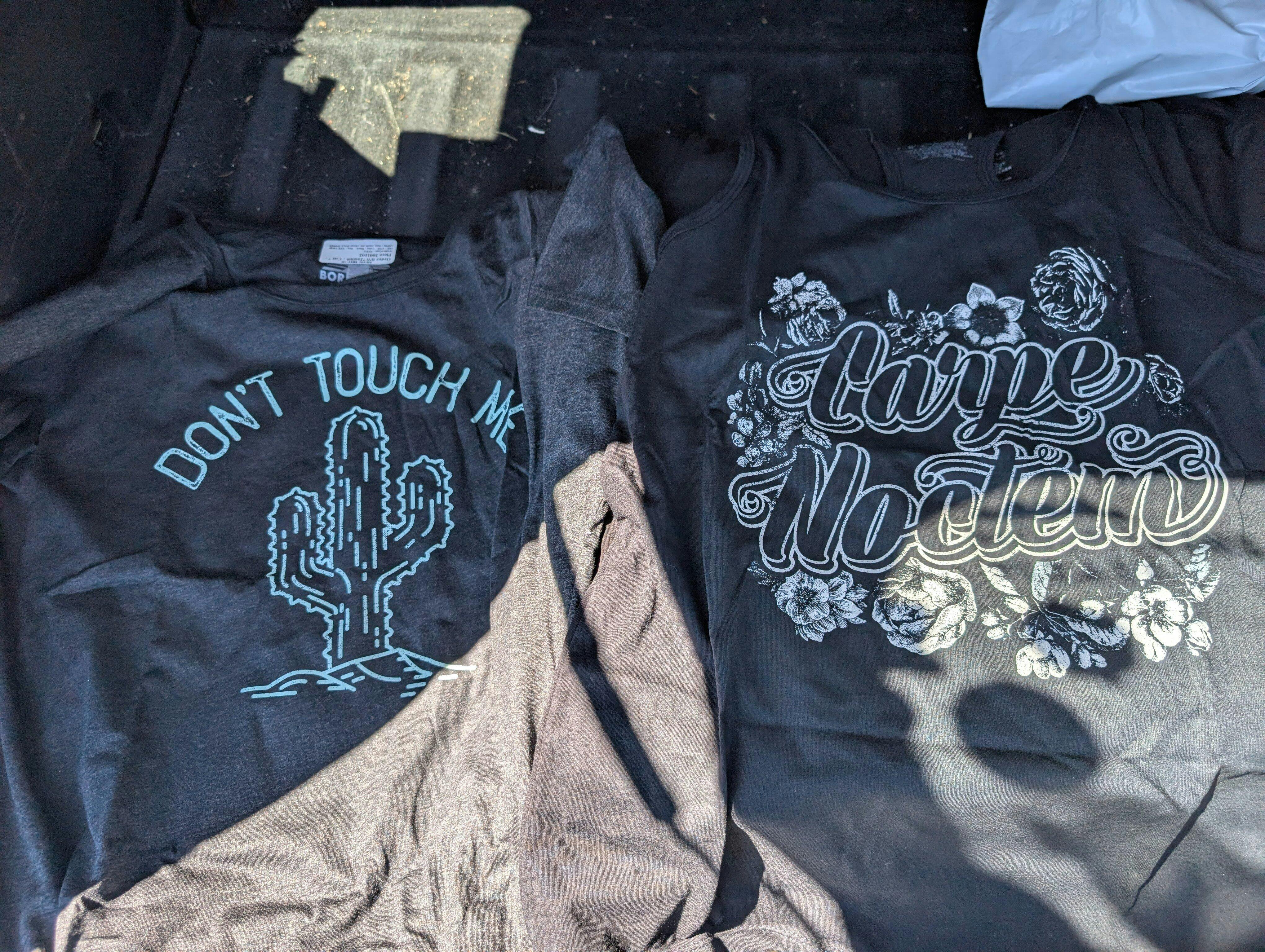 Cool shirt, my husband hates it because it says don't touch me, LOL! Fits good, scoop neck is a little bit big on a small frame though.