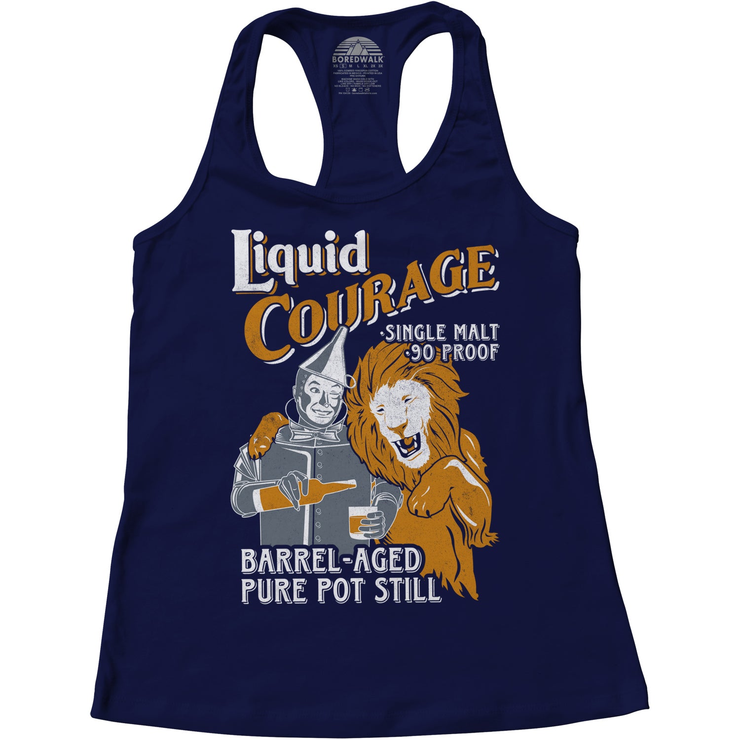 This art nouveau vintage inspired print is a stylized funny nod to the Wizard of Oz and booze. The Tinman is trying to motivate the Cowardly Lion to drink a little whiskey. What could be more fun than a drunk robot with retro flair? This shirt makes a great gift for a mixologist, bartender, or liquor enthusiast. Wear it next time you go drinking at your favorite bar and rack up the compliments on your clever new shirt.