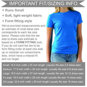 Our womens tees run small and are designed for a form fitting look. We've provided measurements and an estimate of what dress size corresponds to each tee size below. Please note that the tee size to dress size estimate is based on a FORM FITTING look. If you do not want the tee to be form fitting order at least one size up or consider our unisex/mens tees, which have a relaxed fit and run larger.